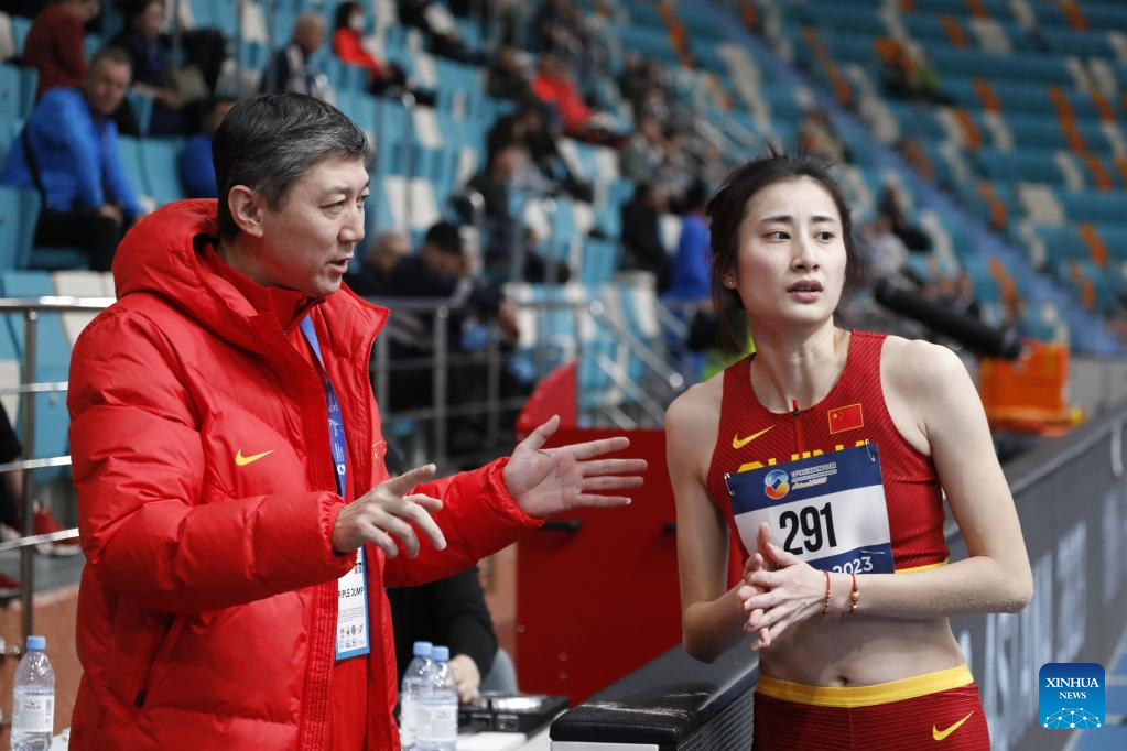 Chen Ting (R) of China talks to her coach during the women's triple jump event at the 10th Asian Indoor Athletics Championships in Astana, Kazakhstan, Feb. 11, 2023. (Photo by Kalizhan Ospanov/Xinhua)