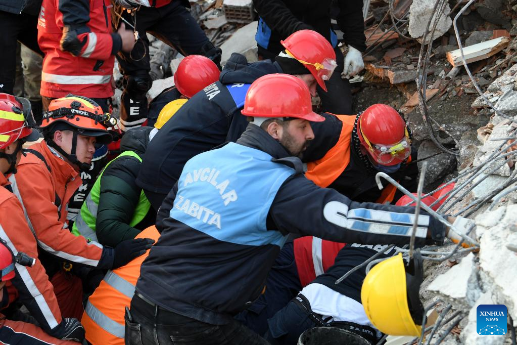 Rescue teams including Chinese rescuers carry out rescue operation on earthquake debris in Antakya in the southern province of Hatay, Trkiye, Feb. 11, 2023. (Xinhua/Shadati)