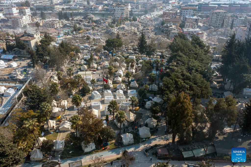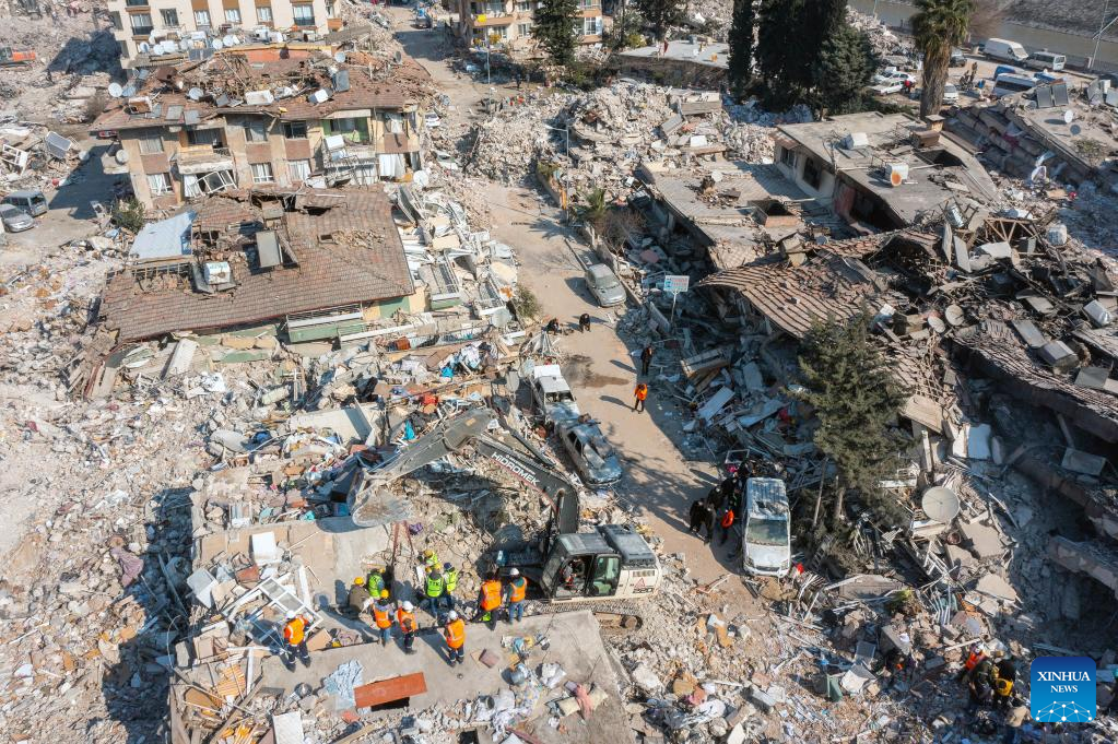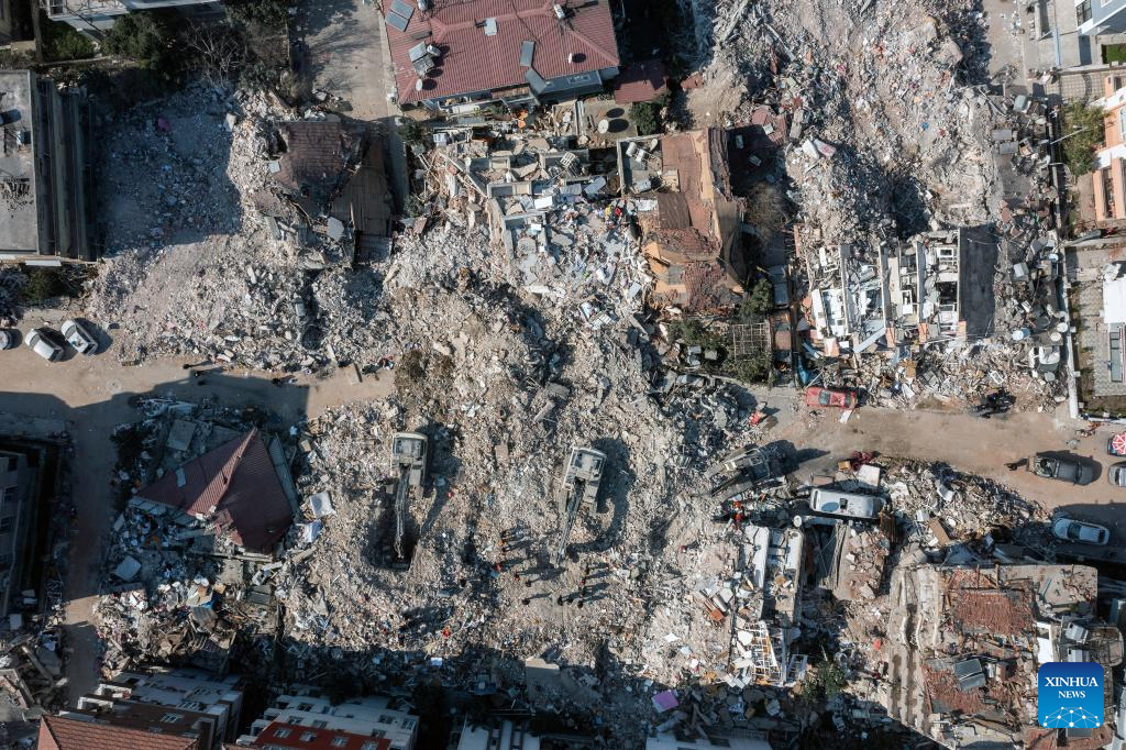 This aerial photo taken on Feb. 12, 2023 shows a scene after the earthquake in Antakya, Hatay Province, Trkiye. The death toll from the twin earthquakes that rocked Trkiye and Syria on Feb. 6 has climbed to 29,605 and 1,414 respectively as of Sunday evening. (Photo by Mustafa Kaya/Xinhua)