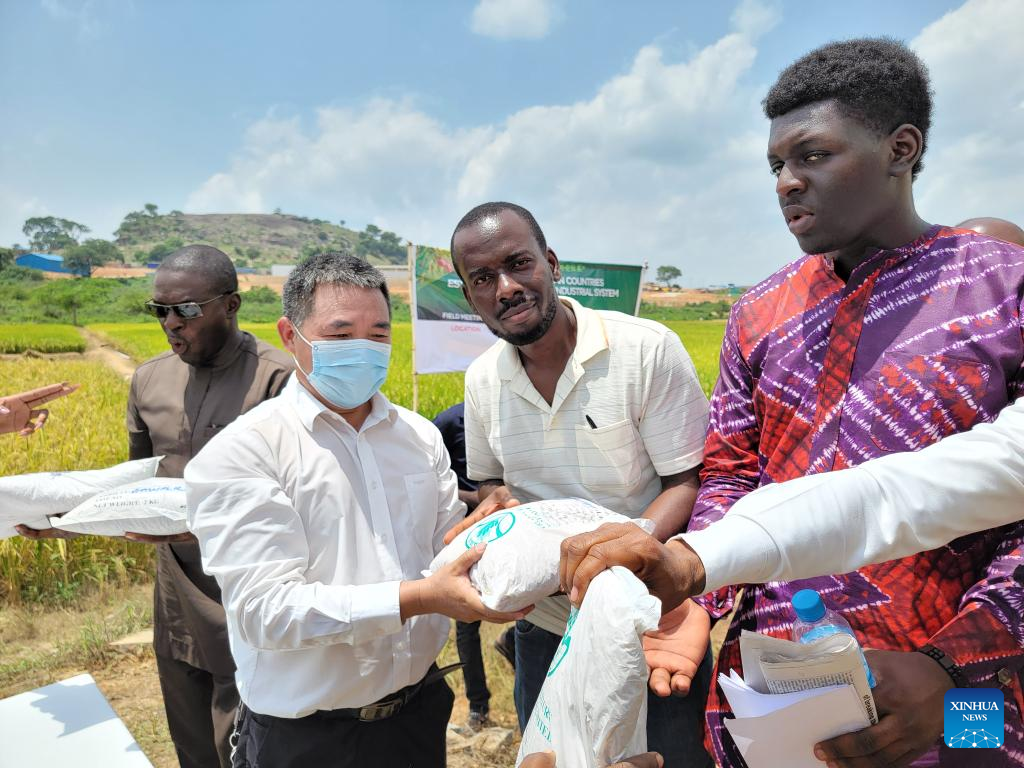 Chinese agriculture expert Wang Xuemin (2nd L) hands over rice seeds to local people at a demonstration farm operated by a Chinese firm in Abuja, Nigeria, June 2, 2022. (Xinhua/Guo Jun)