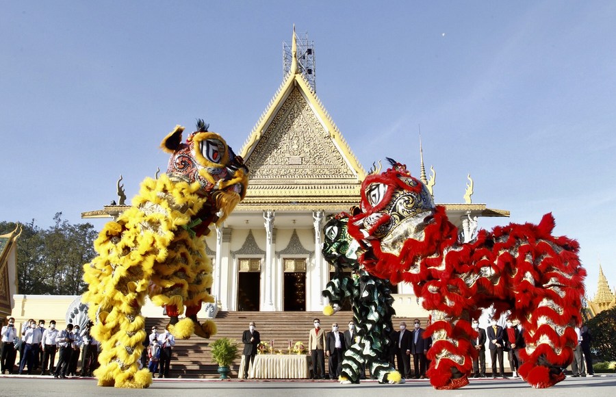 Artists perform lion dance at the Royal Palace in Phnom Penh, Cambodia on Jan. 21, 2023. (Photo by Phearum/Xinhua)