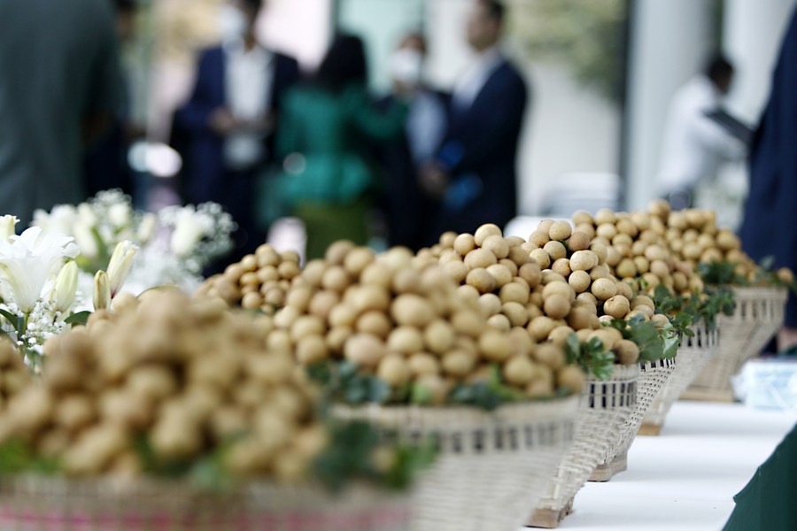 Longan fruits are on display at the launching ceremony of Cambodian longan export to China, in Phnom Penh, Cambodia, on Oct. 27, 2022. (Photo by Phearum/Xinhua)