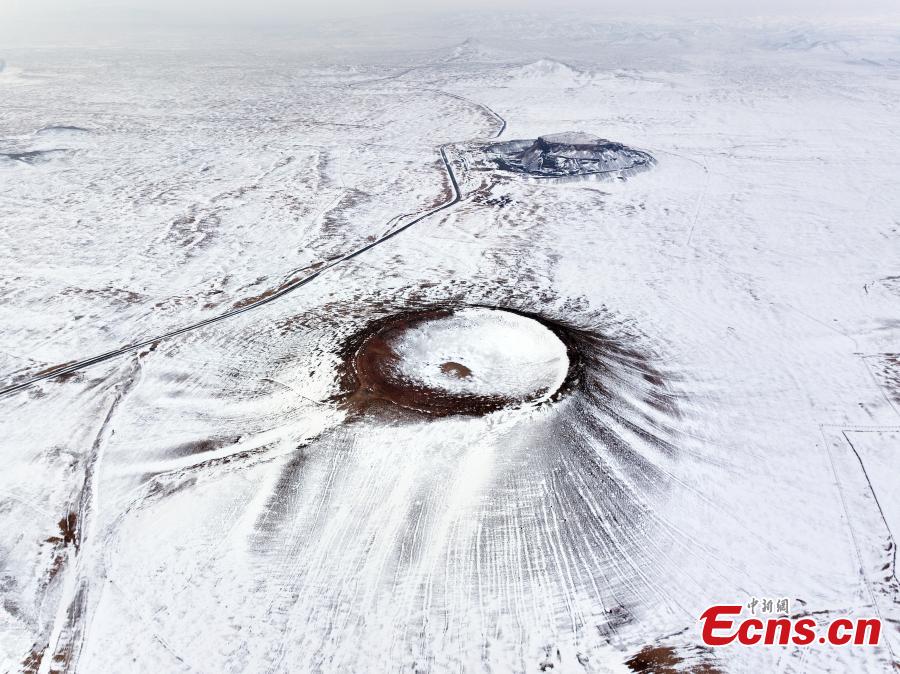 Aerial photo shows volcanoes of Ulanhada volcano cluster covered by snow in Chahar Right Rear Banner of Ulanqab, north China's Inner Mongolia Autonomous Region, Feb. 11, 2023. (Photo: China News Service/Mao Jianjun)