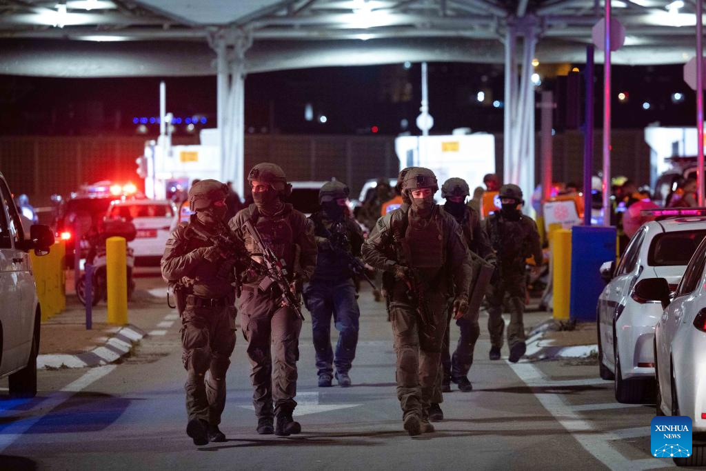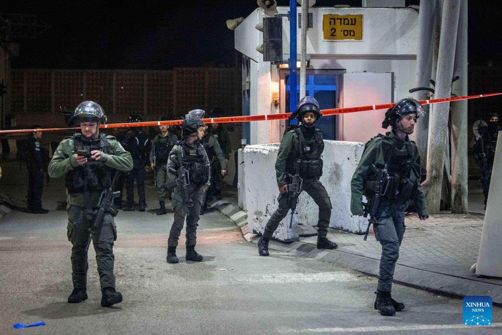Israeli security forces are seen at the scene of a stabbing attack at a checkpoint in the Shuafat refugee camp in East Jerusalem, on Feb. 13, 2023. (JINI via Xinhua)