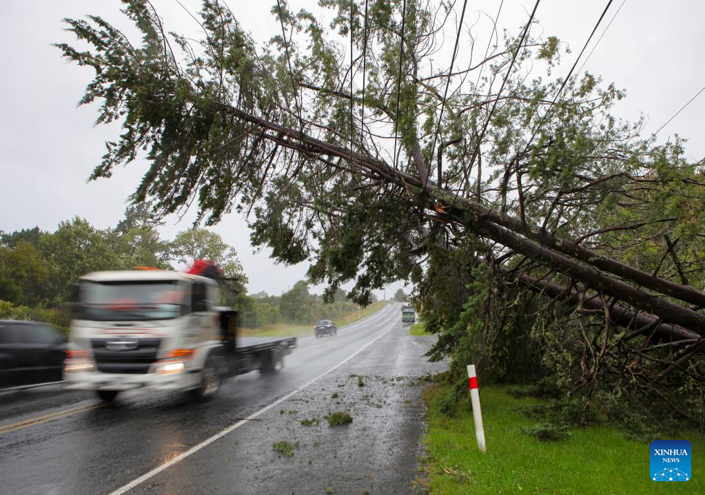 Vehicles drive past fallen trees in Auckland, New Zealand, Feb. 14, 2023. (Photo by Zhao Gang/Xinhua)