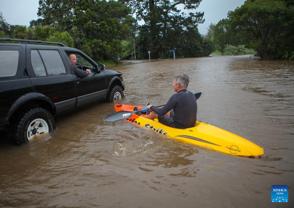 A man kayaks across a flooded street in Auckland, New Zealand, Feb. 14, 2023. (Photo by Zhao Gang/Xinhua)
