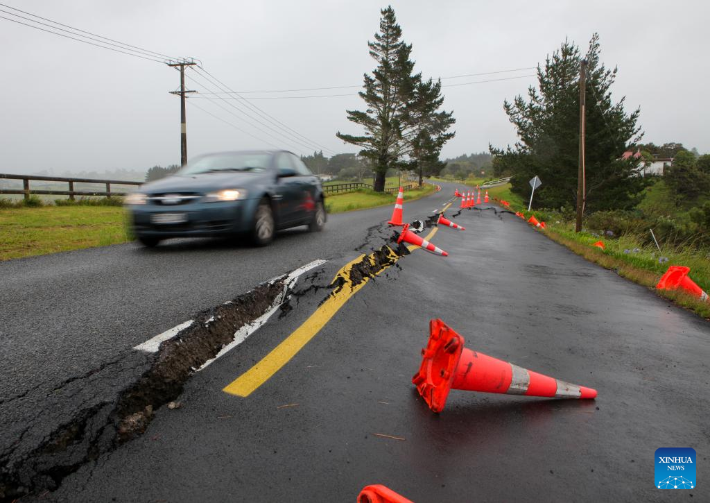 A car drives on a broken road in Auckland, New Zealand, Feb. 14, 2023. (Photo by Zhao Gang/Xinhua)