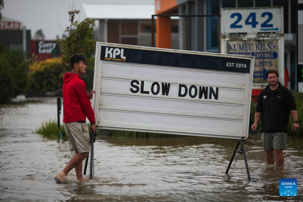 People carry a reminding sign on a flooded road in Auckland, New Zealand, Feb. 14, 2023. (Photo by Zhao Gang/Xinhua)