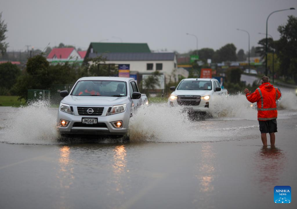 Vehicles drive on a flooded road in Auckland, New Zealand, Feb. 14, 2023. (Photo by Zhao Gang/Xinhua)