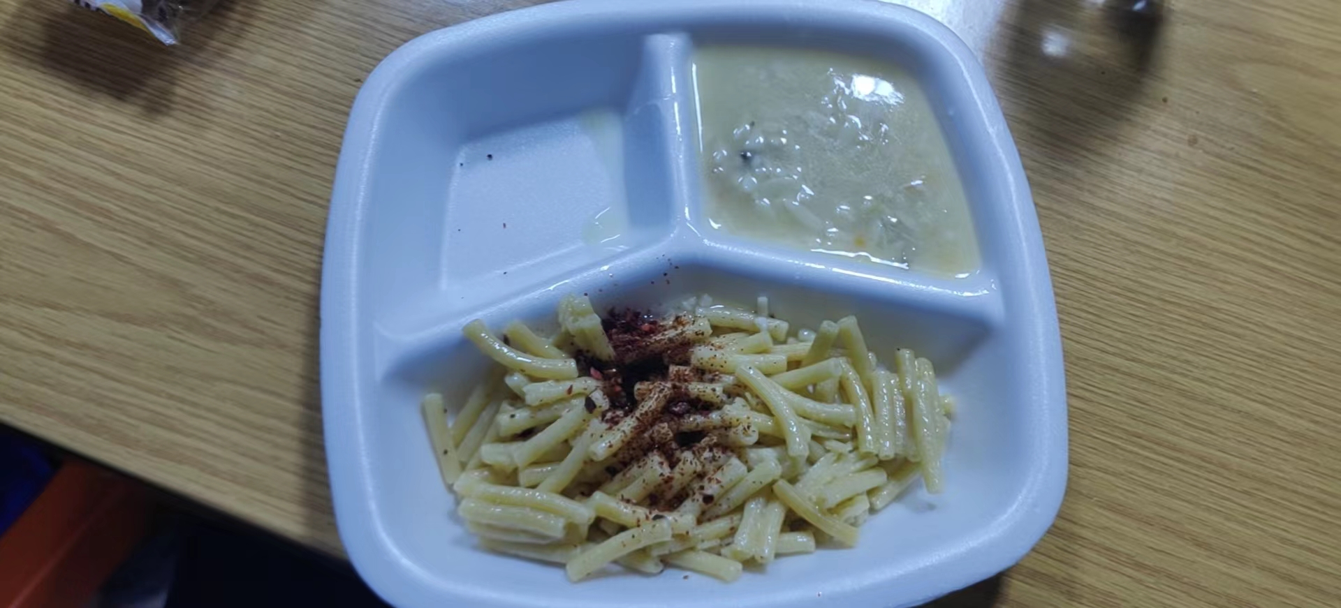 Mushy soup, macaroni, and bread -- these are our meals at the camp canteen. Although it's humble fare, mealtimes give us a rare chance to take a break during the day.
