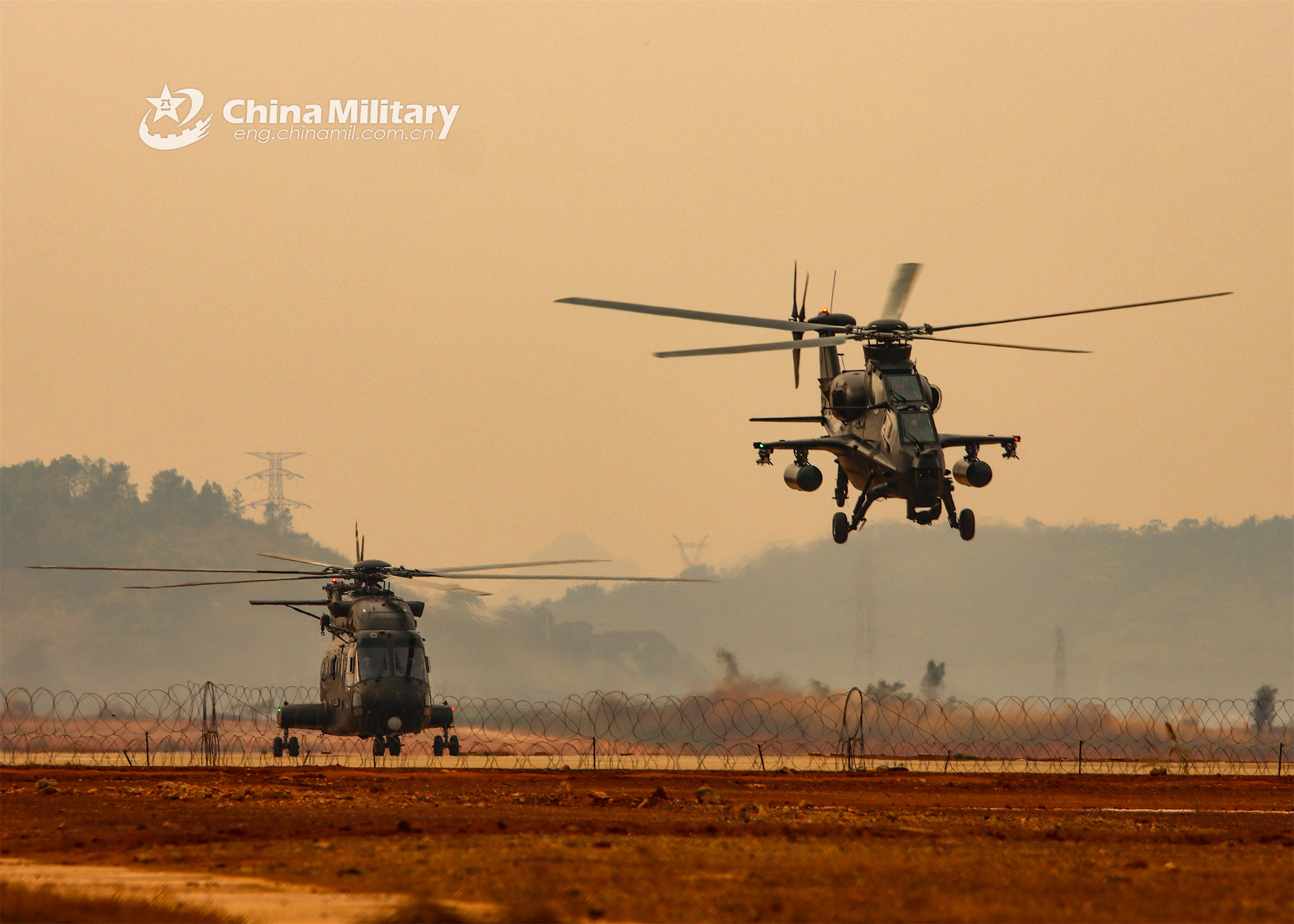 Helicopters attached to an army aviation brigade lift off in succession during a round-the-clock flight training mission in early February, 2023. (eng.chinamil.com.cn/Photo by Guo Zhibo)