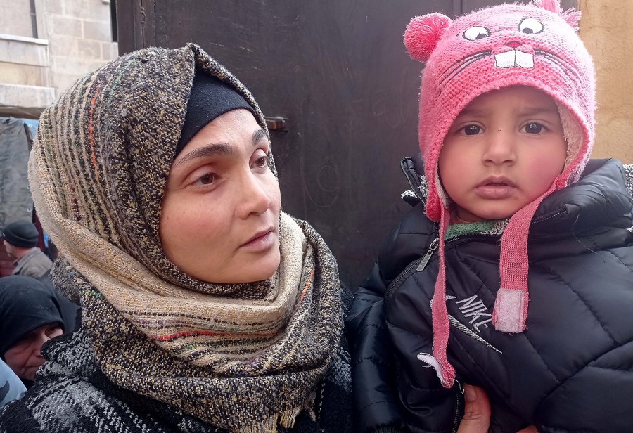 A woman and a child are seen at a displacement center in the Salah al-Deen neighborhood in Aleppo, northern Syria, on Feb. 7, 2023. (Str/Xinhua)