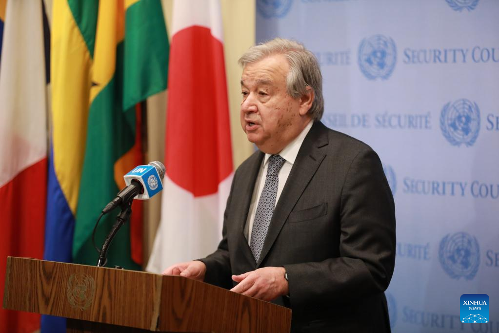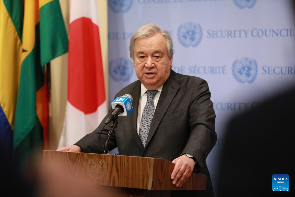 UN Secretary-General Antonio Guterres speaks to reporters at the UN headquarters in New York, on Feb. 14, 2023. (Xinhua/Xie E)
