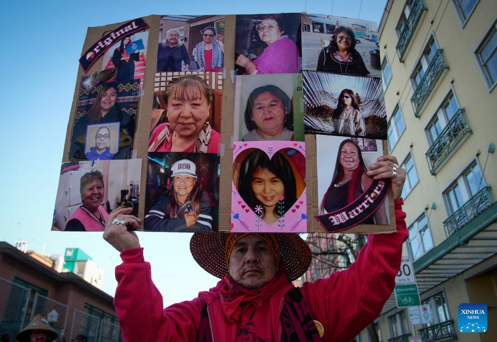 Indigenous women holding photos of victims participate in the Women's Memorial March in Vancouver, British Columbia, Canada, on Feb. 14, 2023. Thousands of people participated in the march to commemorate the missing and murdered indigenous women and girls. (Photo by Liang Sen/Xinhua)
