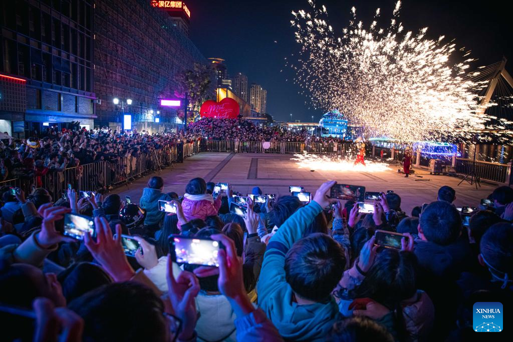People watch "iron flowers", a performance of splashing molten iron to create fireworks, at Laowaitan, a signature pedestrian street in Ningbo, east China's Zhejiang Province, Feb. 15, 2023. As the temperature gradually rises, a series of activities such as night market and "iron flowers" are held at Laowaitan to enrich the night life of citizens and tourists. (Xinhua/Jiang Han)