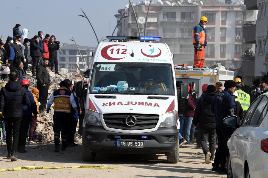 An ambulance is seen near earthquake debris in Antakya in the southern province of Hatay, Türkiye, Feb. 13, 2023. (Xinhua/Shadati)