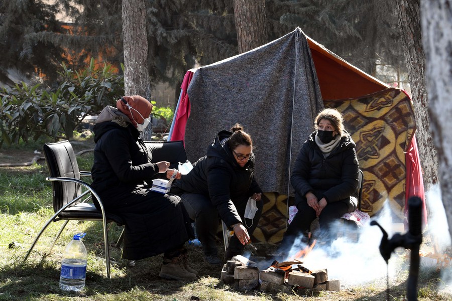 People rest by their temporary shelter in Antakya in the southern province of Hatay, Türkiye, Feb. 14, 2023. (Xinhua/Shadati)