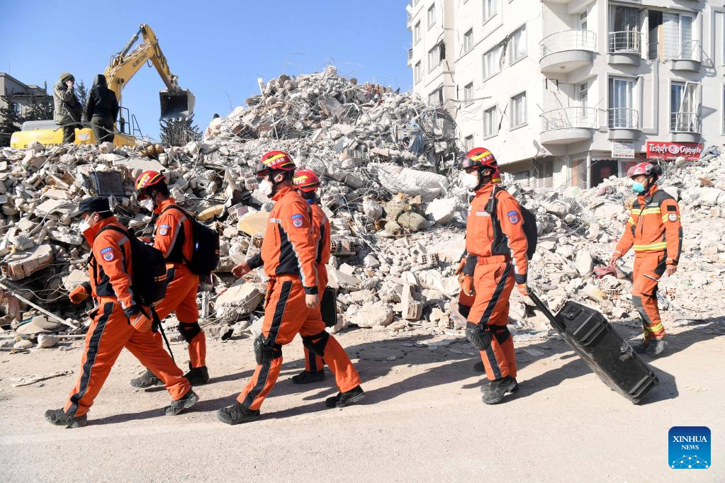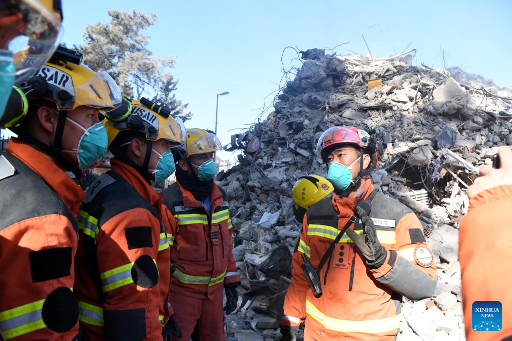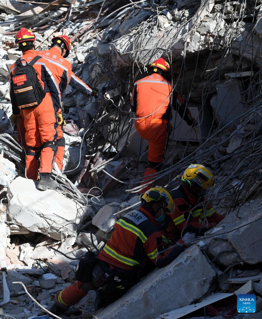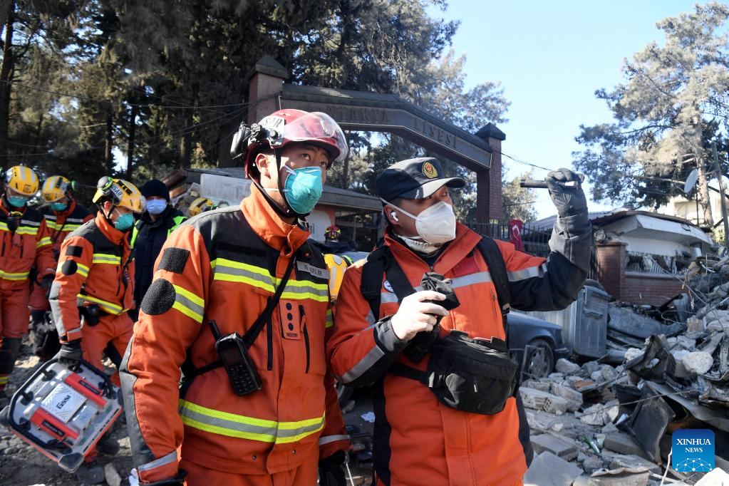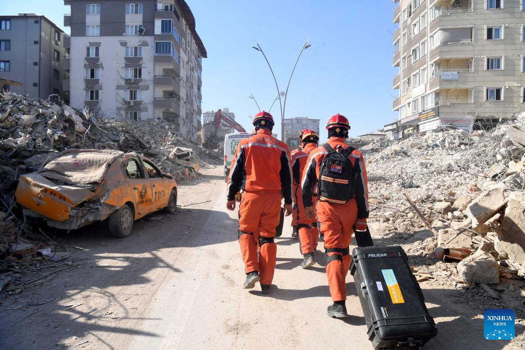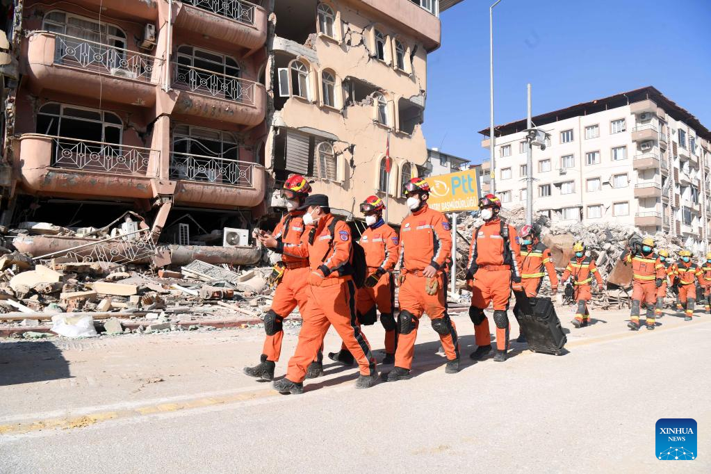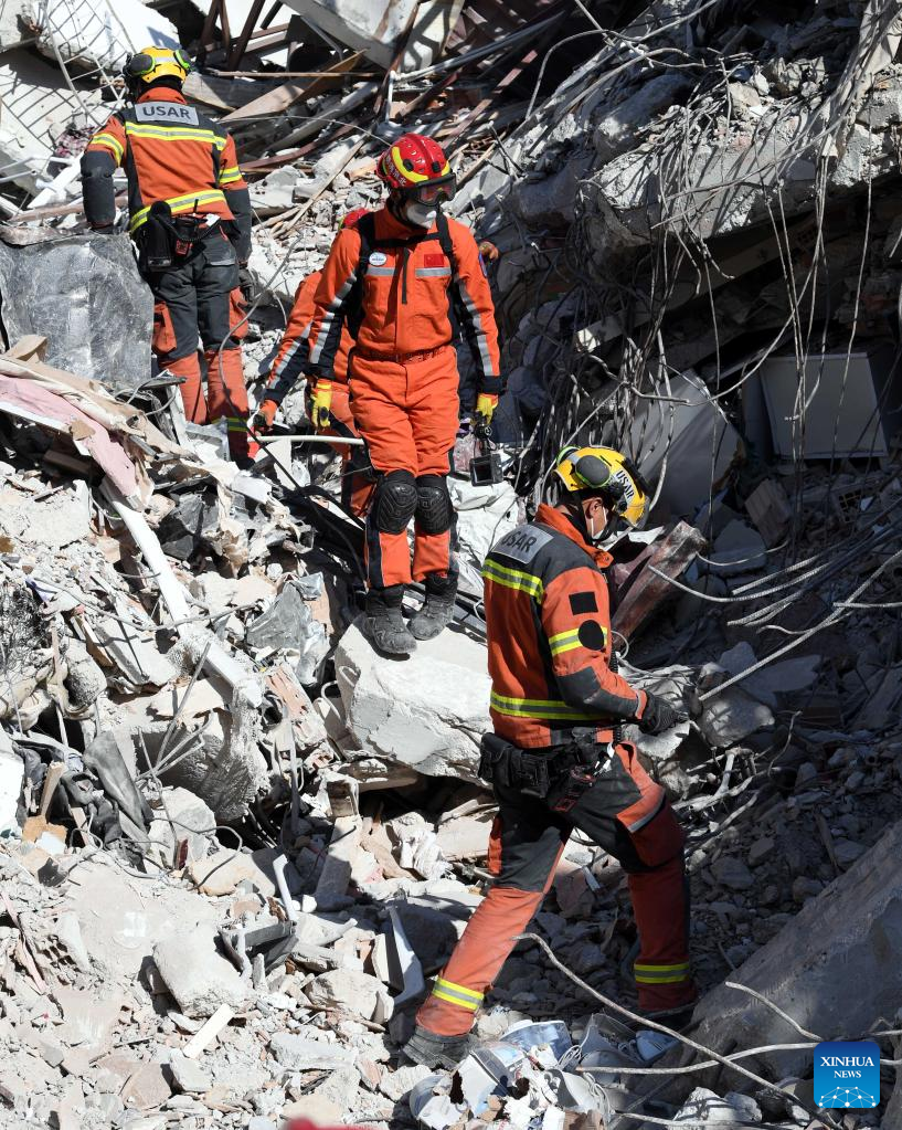 A joint rescue group encompassing members of China Search and Rescue Team and a search and rescue team from the Hong Kong Special Administrative Region (HKSAR) carry out rescue operation among earthquake debris in Antakya, southern province of Hatay, Trkiye, Feb. 14, 2023. China has offered an array of rescue teams and vital items to Trkiye since massive earthquakes and aftershocks jolted the country last week, in an effort to help search for survivors trapped under the rubble. (Xinhua/Shadati)