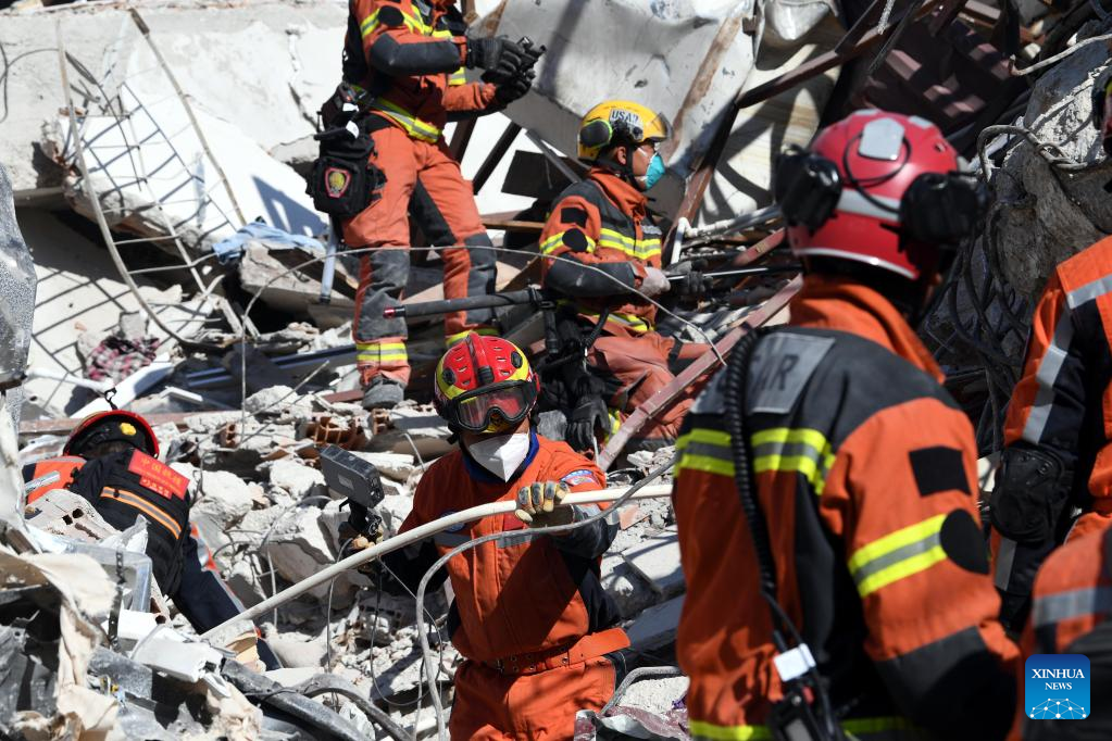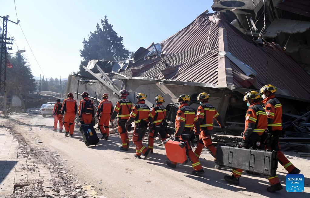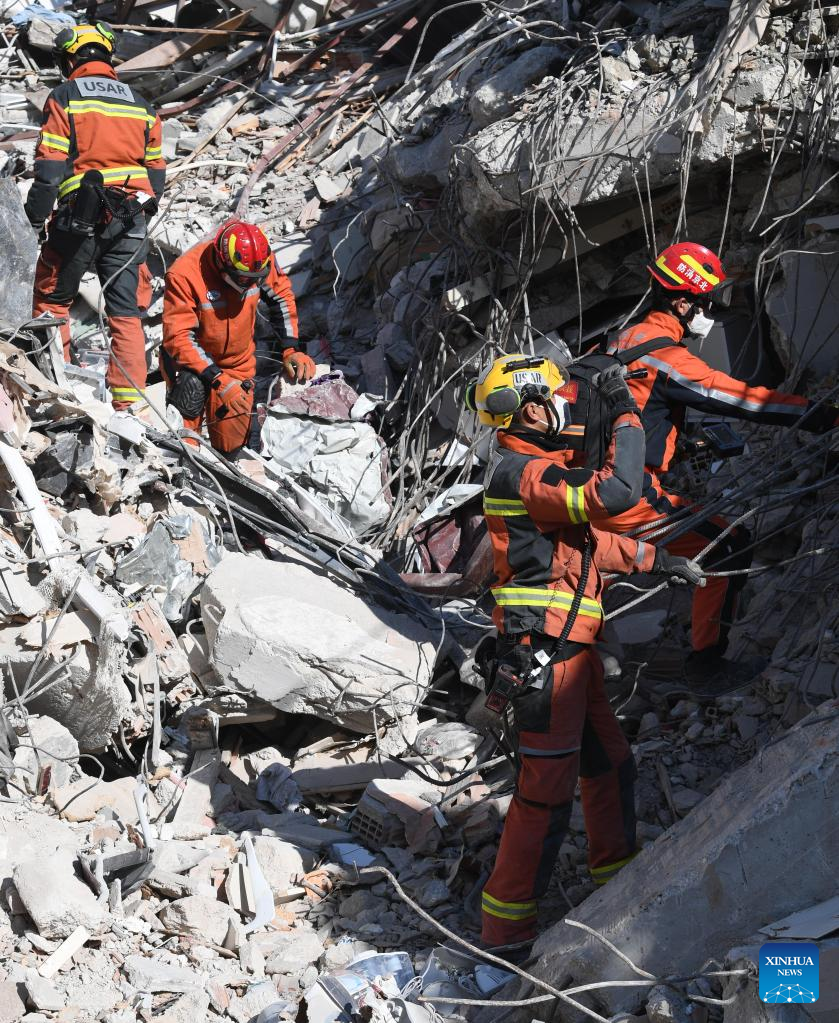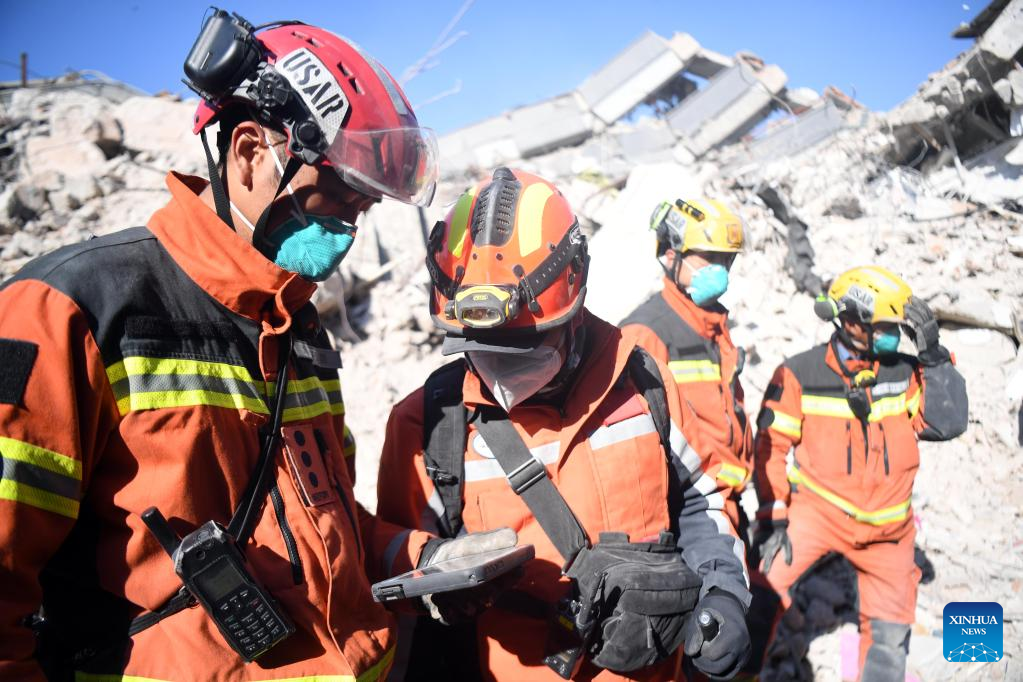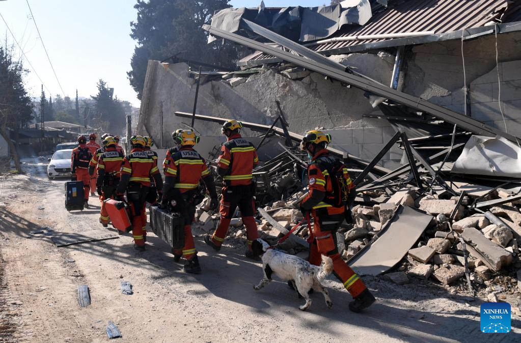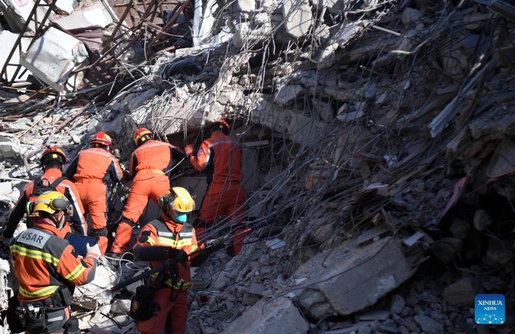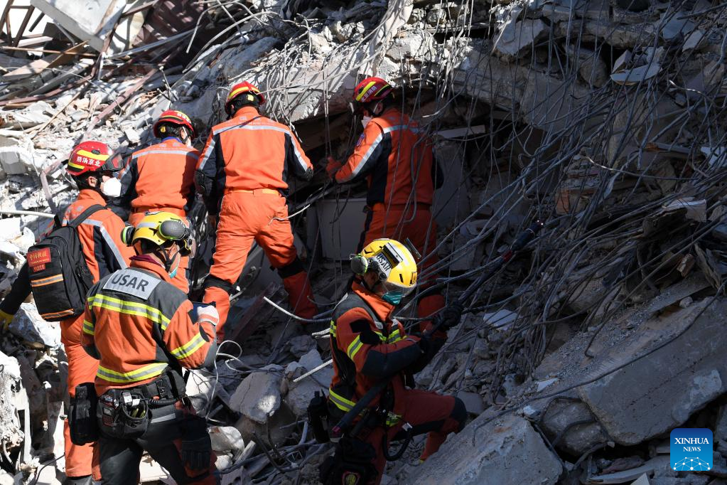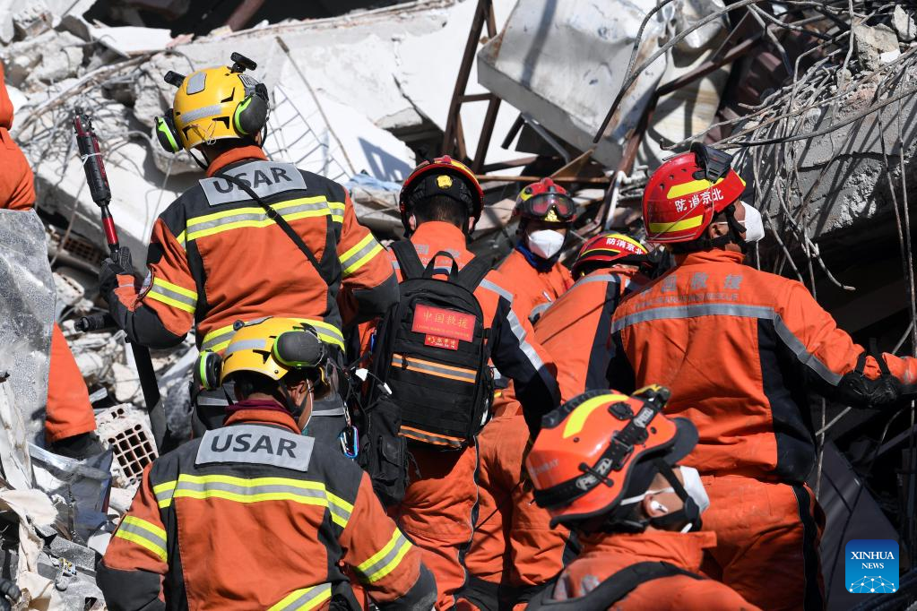 A joint rescue group encompassing members of China Search and Rescue Team and a search and rescue team from the Hong Kong Special Administrative Region (HKSAR) carry out rescue operation among earthquake debris in Antakya, southern province of Hatay, Trkiye, Feb. 14, 2023. China has offered an array of rescue teams and vital items to Trkiye since massive earthquakes and aftershocks jolted the country last week, in an effort to help search for survivors trapped under the rubble. (Xinhua/Shadati)