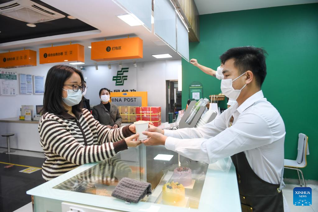 A customer gets a cup of coffee at a coffee-themed post office in Nanshan District in Shenzhen, south China's Guangdong Province, Feb. 15, 2023. (Xinhua/Mao Siqian)
