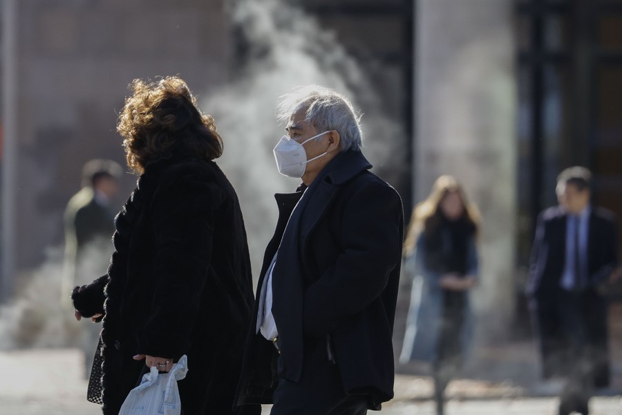 A man wearing a face mask is seen on a street in Washington, D.C., the United States, on Dec. 16, 2022. (Photo by Ting Shen/Xinhua)
