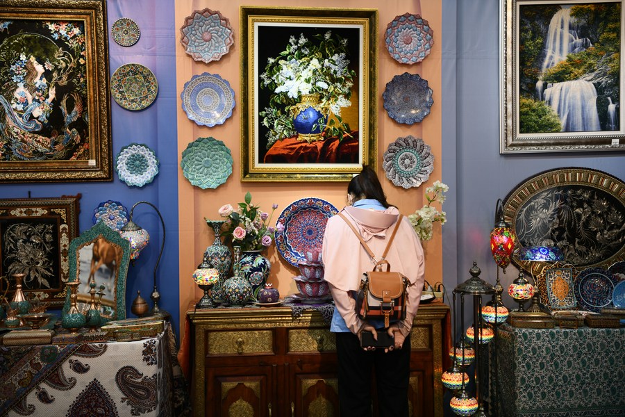 A visitor views exhibits at the booth of Iran during the 18th China-ASEAN Expo in Nanning, capital of south China's Guangxi Zhuang Autonomous Region, Sept. 12, 2021. (Xinhua/Xu Jiayi)