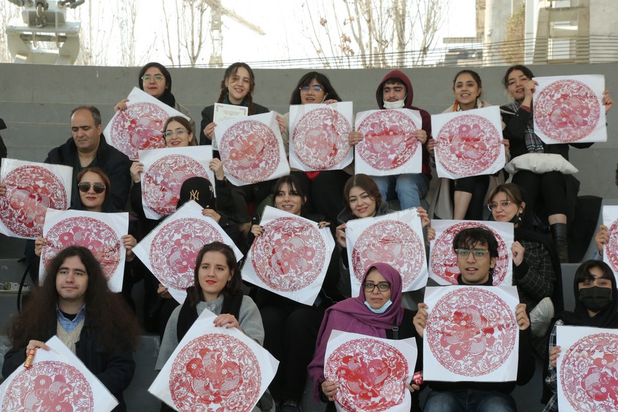 Iranian students display Chinese Lunar New Year decorations at a park in Tehran, Iran, on Jan. 18, 2023. (Xinhua/Gao Wencheng)