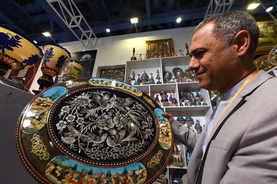 An Iranian exhibitor shows an ornament at the Trade In Services exhibition area during the second China International Import Expo (CIIE) in Shanghai, east China, Nov. 5, 2019. (Xinhua/Yin Ke)