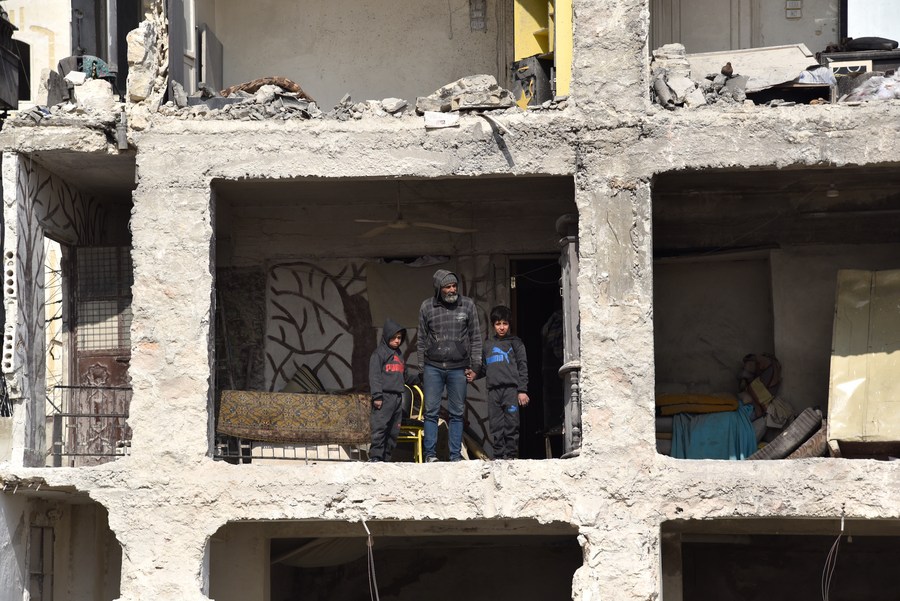 Ali Abdul-Rahman and his two kids stand on the side of his destroyed porch at his house in the Masharqa neighborhood in Aleppo city, northern Syria, Feb. 13, 2023. (Photo by Monsef Memari/Xinhua)