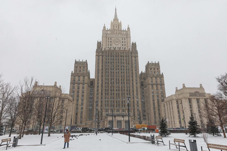 People walk near the building of the Russian Foreign Ministry in Moscow March 28, 2022. (Xinhua/Bai Xueqi)