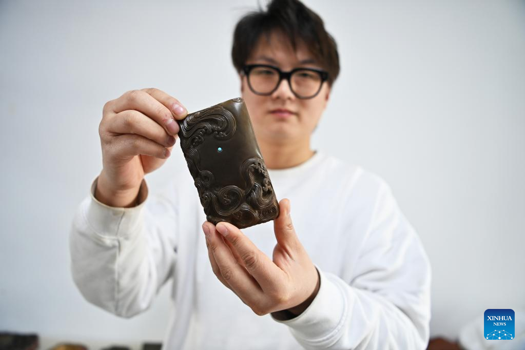 Lin Xiaolin displays a Chengni inkstone designed by him in a studio in Xinjiang County of Yuncheng, north China's Shanxi Province, Feb. 15, 2023. (Xinhua/Yang Chenguang)