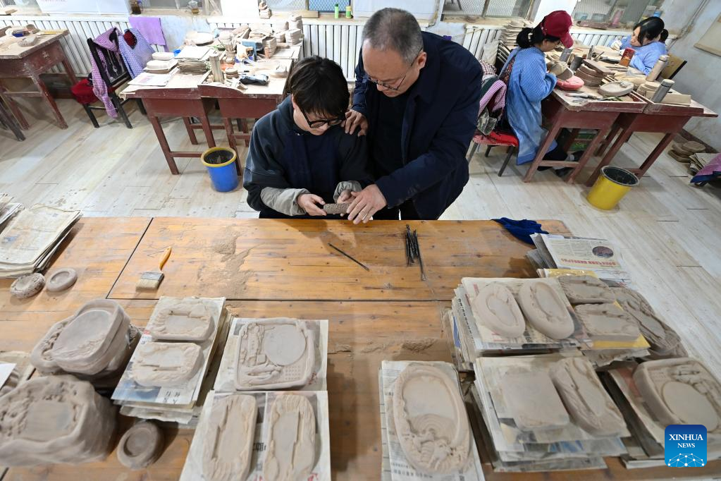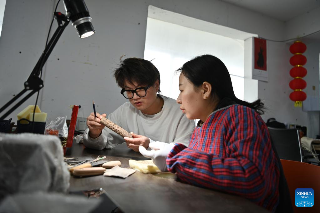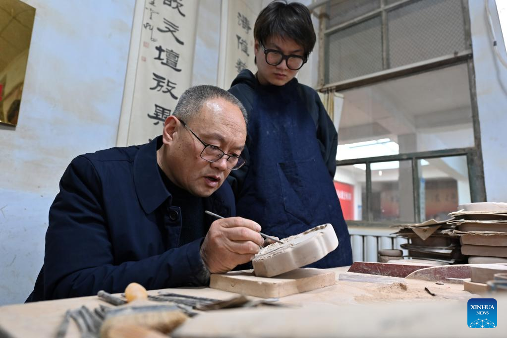 Lin Tao (L), a representative inheritor of the craft of making Chengni inkstone at the provincial level, guides his son Lin Xiaolin on the details of carving on Chengni inkstone in Guangcun Village of Xinjiang County in Yuncheng, north China's Shanxi Province, Feb. 14, 2023. (Xinhua/Yang Chenguang)