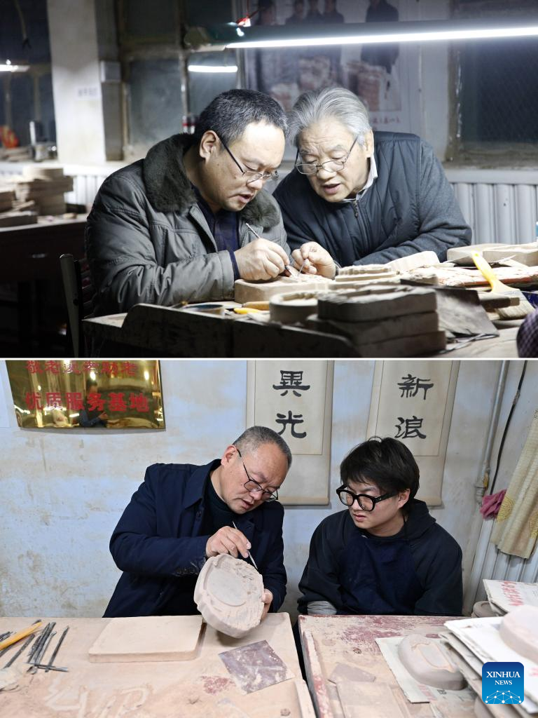 This combo photo shows Lin Tao (L) and his father Lin Yongmao making a Chengni inkstone in Guangcun Village of Xinjiang County in Yuncheng, north China's Shanxi Province, Nov. 14, 2015 (upper) and Lin Tao (L) communicating with his son Lin Xiaolin on the craft of making Chengni inkstone in Guangcun Village, Feb. 14, 2023 (lower, photo taken by Yang Chenguang).