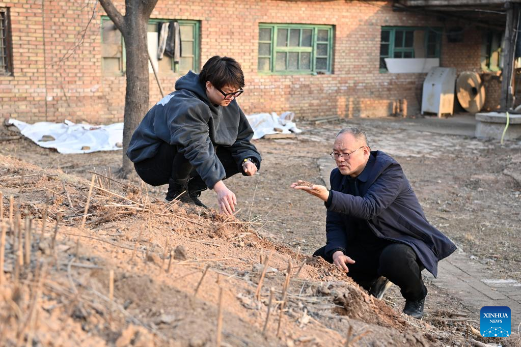 Lin Xiaolin communicates with his father Lin Tao (R) on the mud choosing for making Chengni inkstone in Guangcun Village of Xinjiang County in Yuncheng, north China's Shanxi Province, Feb. 14, 2023. (Xinhua/Yang Chenguang)