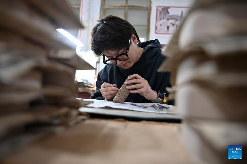 Lin Xiaolin carves on a Chengni inkstone in Guangcun Village of Xinjiang County in Yuncheng, north China's Shanxi Province, Feb. 14, 2023. (Xinhua/Yang Chenguang)
