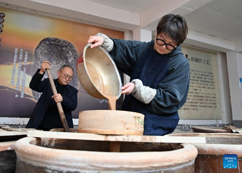 Lin Xiaolin (R) filters the mud to make Chengni inkstone in Guangcun Village of Xinjiang County in Yuncheng, north China's Shanxi Province, Feb. 14, 2023. (Xinhua/Yang Chenguang)