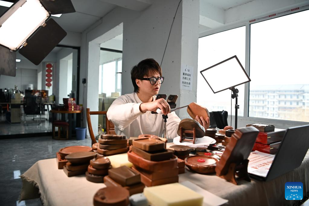 Lin Xiaolin presents Chengni inkstones via live streaming in a studio in Xinjiang County of Yuncheng, north China's Shanxi Province, Feb. 15, 2023. (Xinhua/Yang Chenguang)