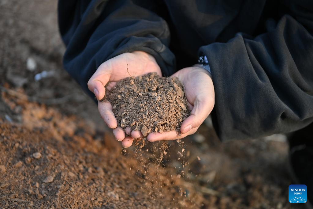 Lin Xiaolin chooses mud to make Chengni inkstone in Guangcun Village of Xinjiang County in Yuncheng, north China's Shanxi Province, Feb. 14, 2023. (Xinhua/Yang Chenguang)