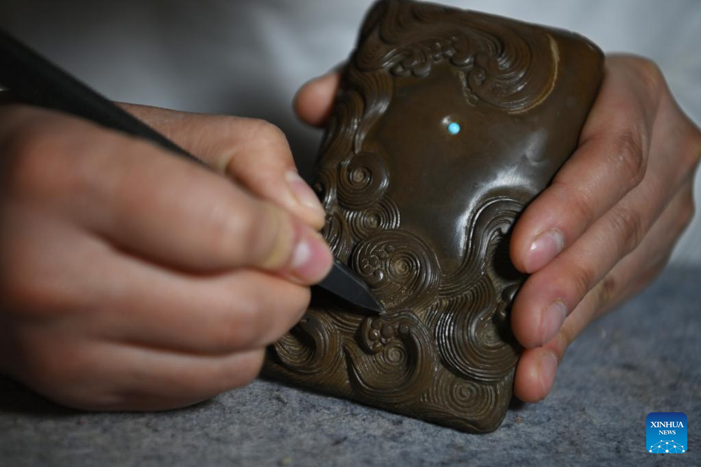Lin Xiaolin carves on a Chengni inkstone in a studio in Xinjiang County in Yuncheng, north China's Shanxi Province, Feb. 15, 2023. (Xinhua/Yang Chenguang)
