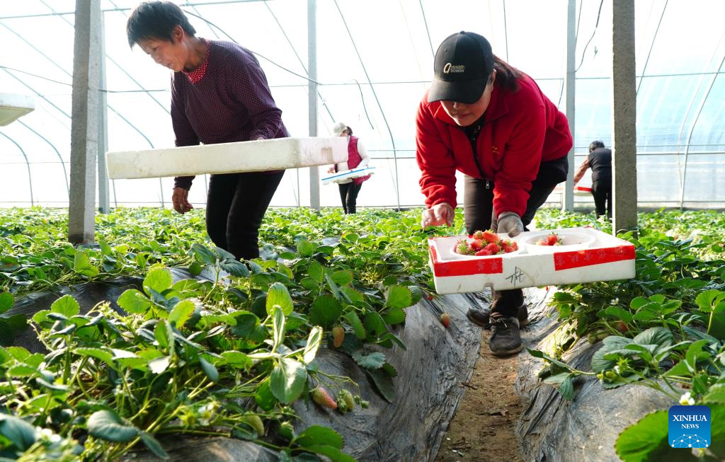 Villagers pick strawberries in a greenhouse in Wuyan Village of Dongping County, east China's Shandong Province, Feb. 16, 2023. Strawberries have entered the harvest season in Dongping County. Villagers are busy picking strawberries to meet market demands. (Xinhua/Xu Suhui)