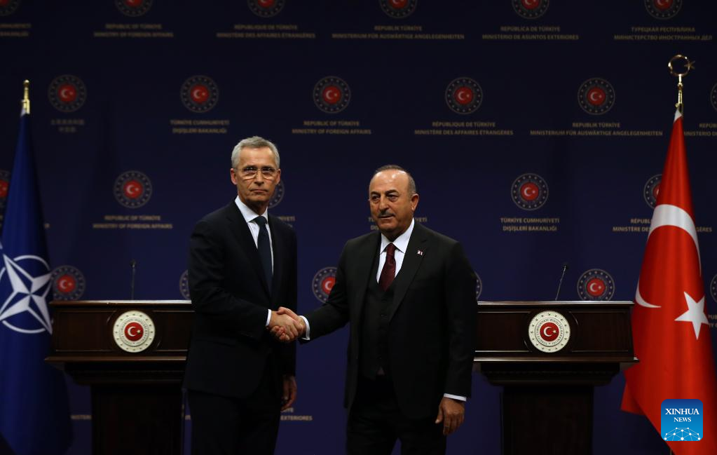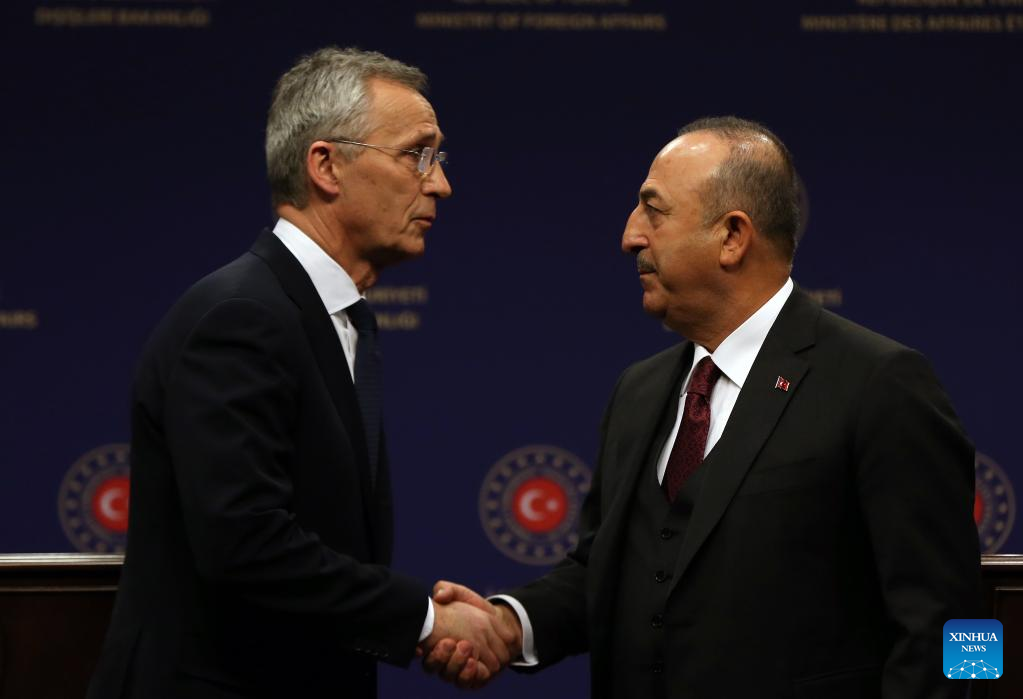 Turkish Foreign Minister Mevlut Cavusoglu (R) shakes hands with NATO Secretary General Jens Stoltenberg at a joint press conference in Ankara, Trkiye, on Feb. 16, 2023. NATO Secretary General Jens Stoltenberg voiced the bloc's solidarity with quake-hit Trkiye on Thursday, saying that the alliance conveyed Trkiye's demands to "all the allies." (Photo by Mustafa Kaya/Xinhua)