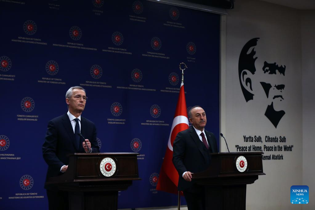 Turkish Foreign Minister Mevlut Cavusoglu (R) and NATO Secretary General Jens Stoltenberg attend a joint press conference in Ankara, Trkiye, on Feb. 16, 2023. NATO Secretary General Jens Stoltenberg voiced the bloc's solidarity with quake-hit Trkiye on Thursday, saying that the alliance conveyed Trkiye's demands to "all the allies." (Photo by Mustafa Kaya/Xinhua)