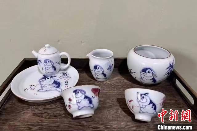 A rabbit-themed tea set represents the traditional craft of Qin’an Pottery. The pottery pieces are decorated with rabbits and plums, signifying good fortune and longevity. It took the design team four months to complete the work.