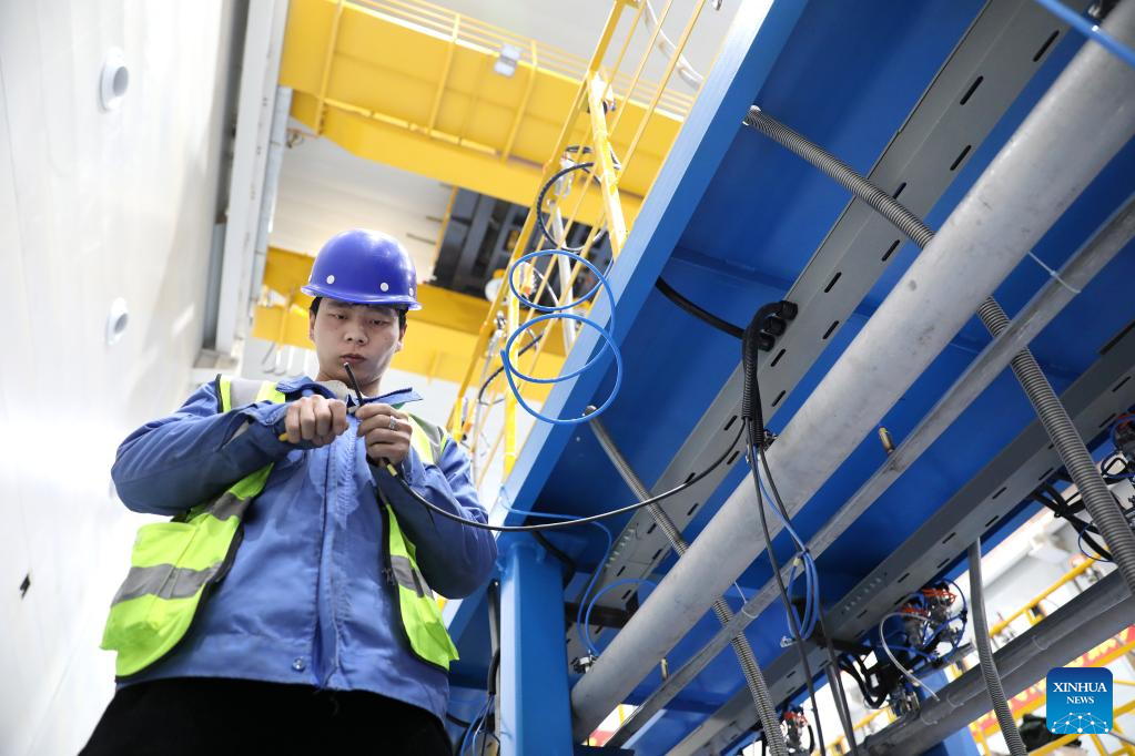 An employee works at the TBEA Shenyang Transformer Group Co., Ltd. in Shenyang, northeast China's Liaoning Province, Feb. 16, 2023. Equipment manufacturing enterprises in Liaoning have been busy with production to meet the orders and to make a good start in the first quarter of 2023. (Xinhua/Yao Jianfeng)