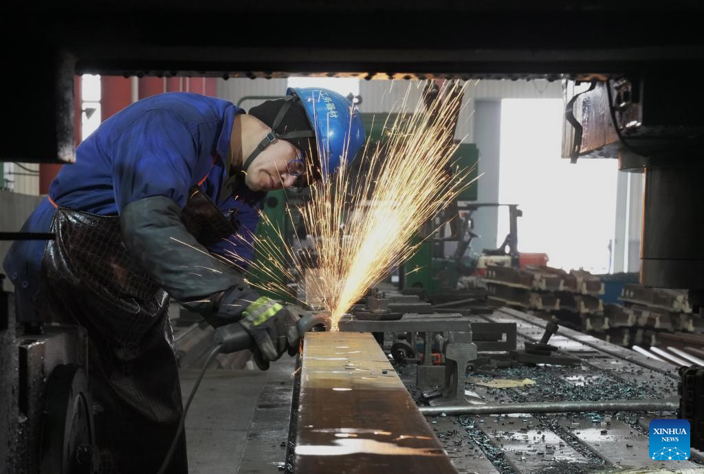 A worker operates at a workshop of a railway equipment manufacturing enterprise in Qinhuangdao, north China's Hebei Province, Feb. 16, 2023. (Xinhua/Yang Shiyao)