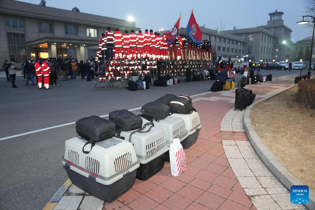 Members of rescue teams dispatched by the Chinese mainland and Hong Kong Special Administrative Region along with four rescue dogs of the Chinese rescue team arrive in Beijing, capital of China, Feb. 17, 2023. Rescue teams dispatched by the Chinese mainland and Hong Kong Special Administrative Region returned to Beijing on a chartered plane Friday afternoon, after completing their rescue missions in Trkiye, according to the Ministry of Emergency Management. (Xinhua/Cai Yang)