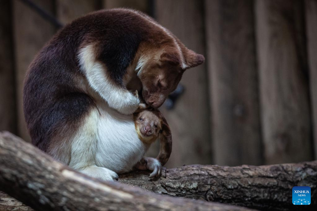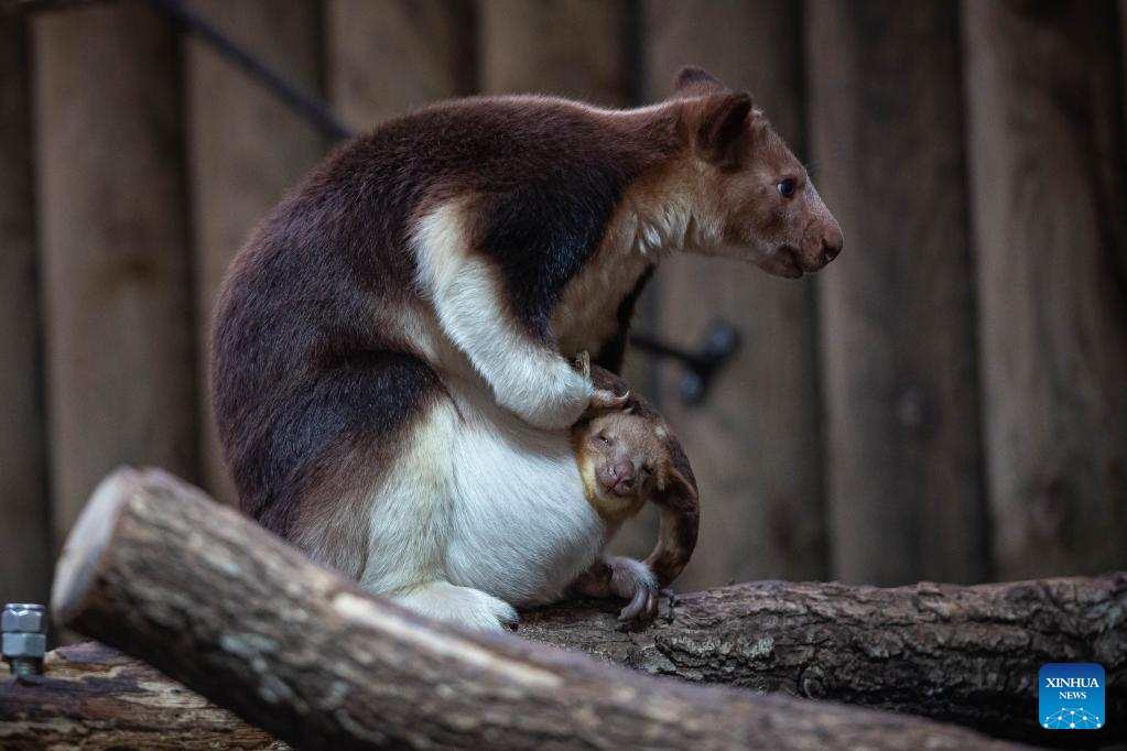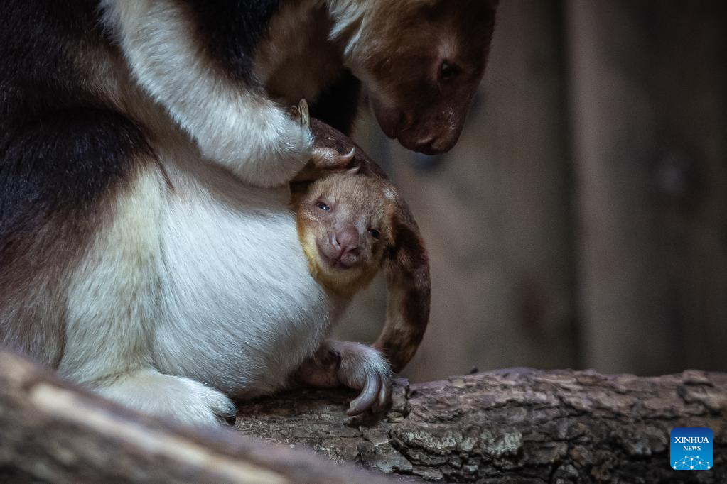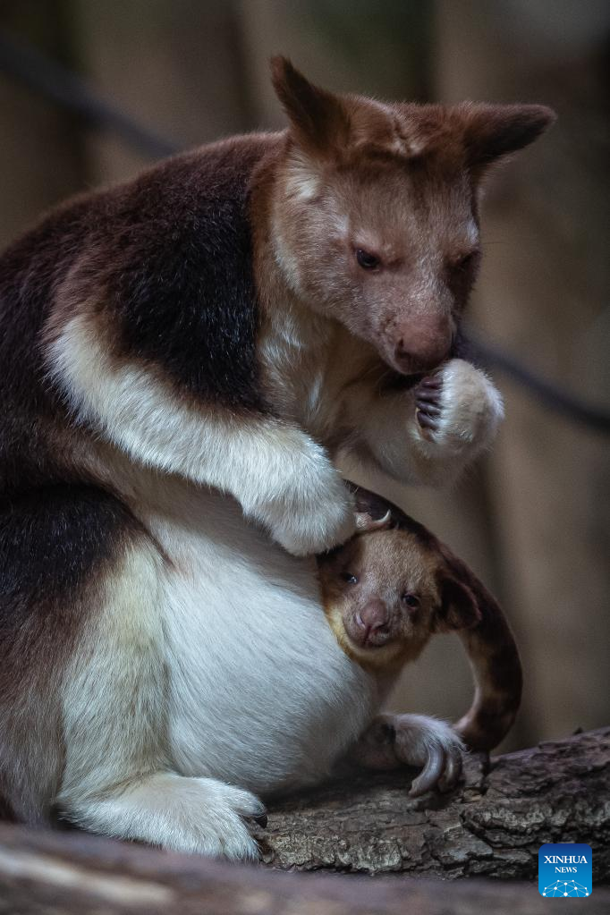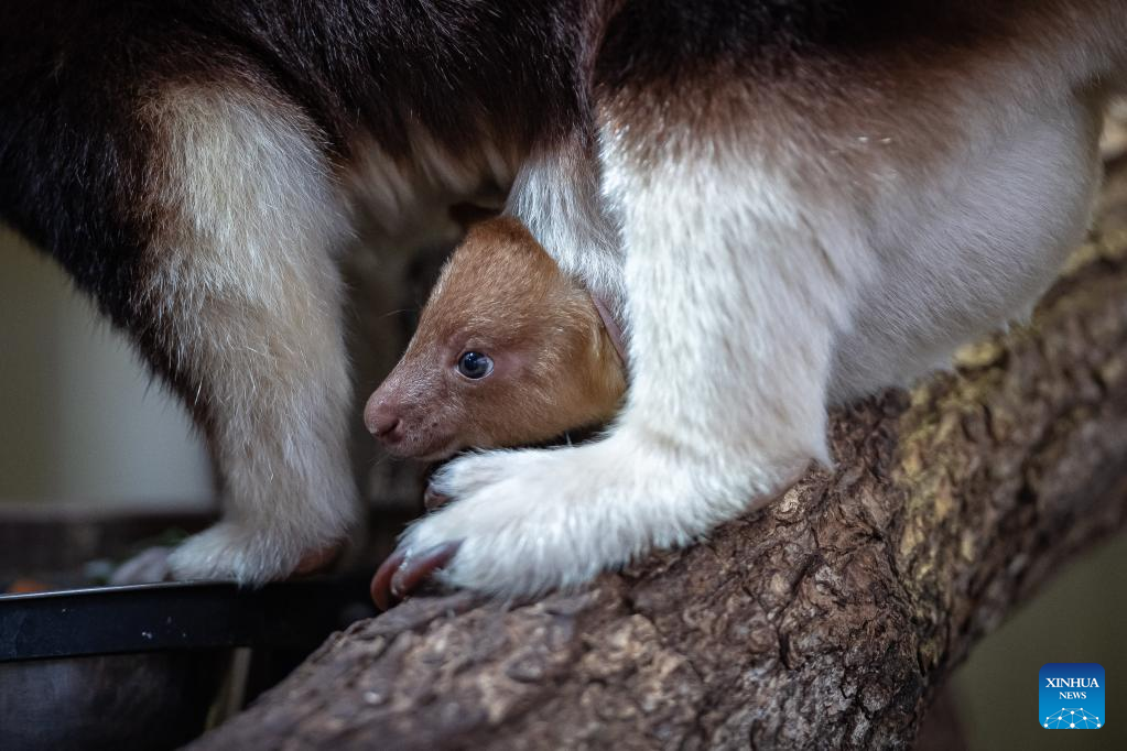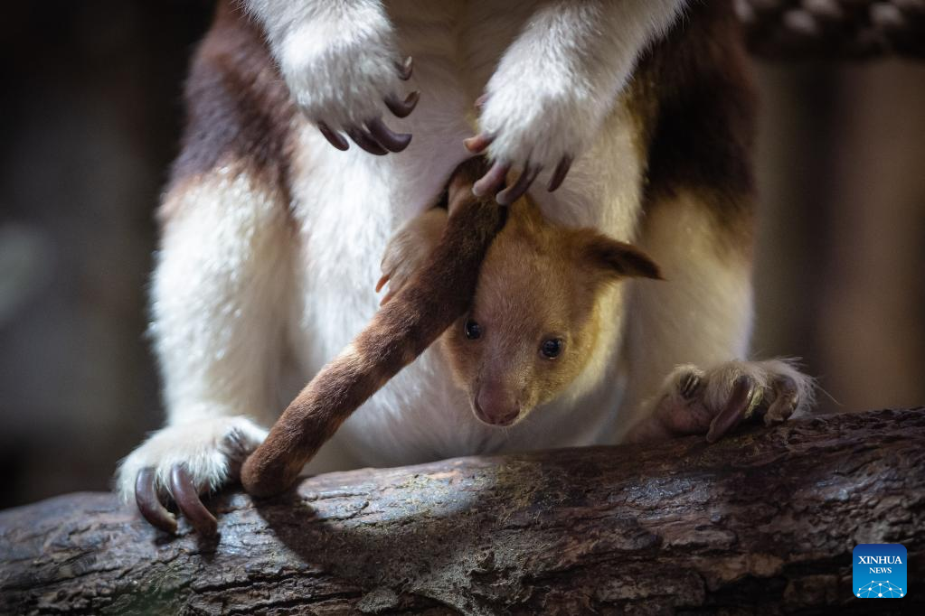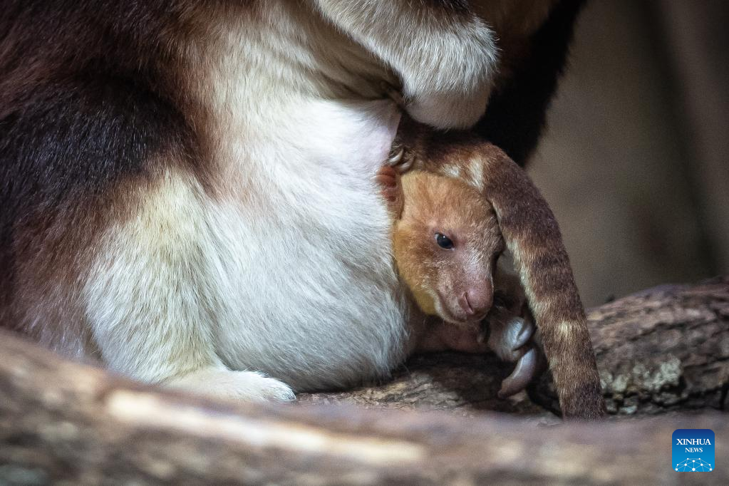A Goodfellow's tree kangaroo joey peeks out of its mother's pouch at a zoo in Paris, France, Feb. 17, 2023. The Goodfellow's tree kangaroo is classified as "endangered" on the International Union for Conservation of Nature (IUCN) Red List of Threatened Species. (Photo by Aurelien Morissard/Xinhua)