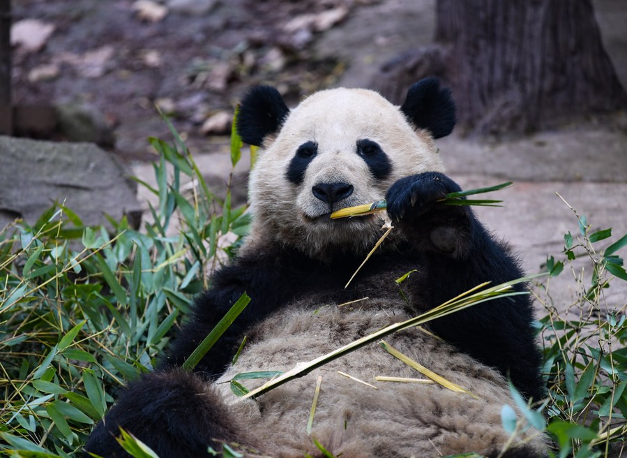 A giant panda feeds on bamboo at the Dujiangyan base of the China Conservation and Research Center for Giant Panda in Dujiangyan, southwest China's Sichuan Province, Feb. 15, 2023. (Xinhua/Wang Xi)