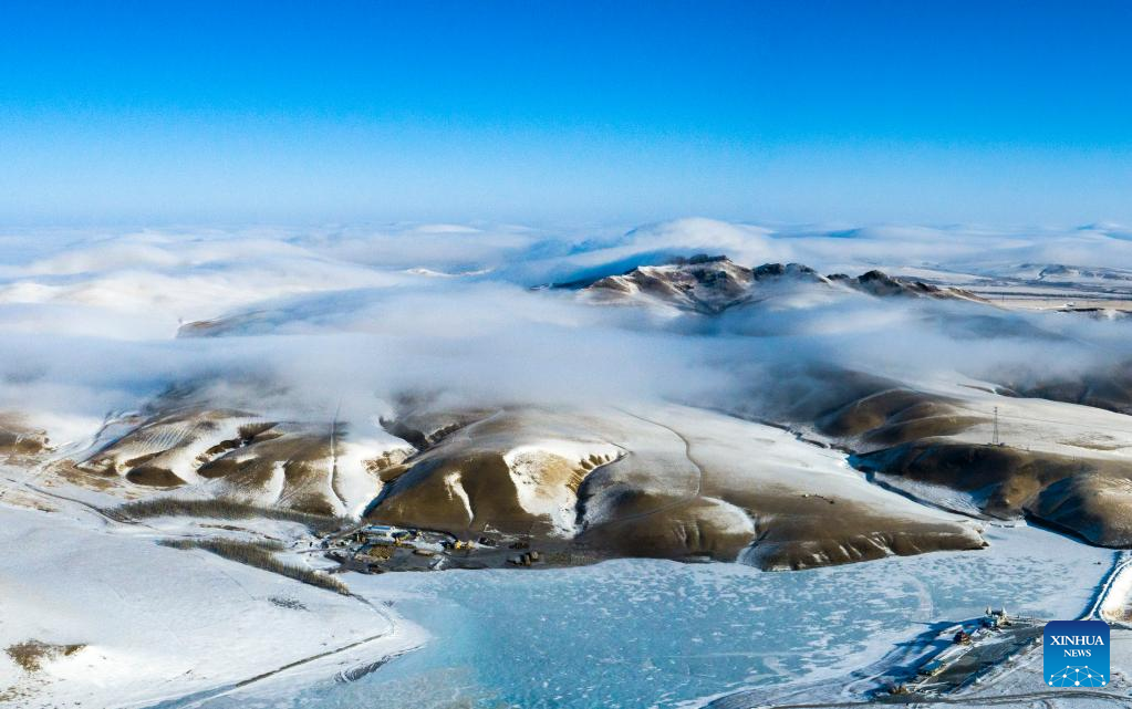 This aerial photo taken on Feb. 18, 2023 shows a snow-covered grassland in Holin Gol, north China's Inner Mongolia Autonomous Region. (Photo by Wang Zheng/Xinhua)