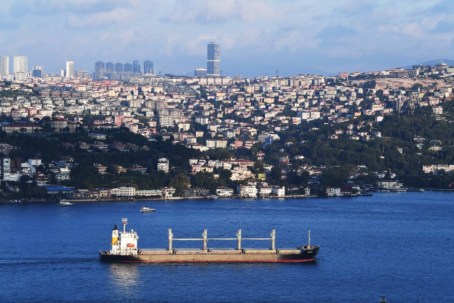 A vessel transporting grain from Ukraine passes through the Bosphorus Strait in Istanbul, Türkiye, Aug. 7, 2022. (Xinhua/Shadati)